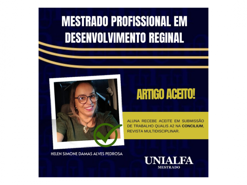 Logro académico: Alumna del MDR recibe aceptación en Revista Concilium Alumna del programa de Maestría Profesional en Desarrollo Regional – MDR de la UNIALFA, Helen Simone Damas Alves Pedrosa, recibe aceptación en la presentación de un trabajo Qualis A2 en Concilium, revista multidisciplinaria.
